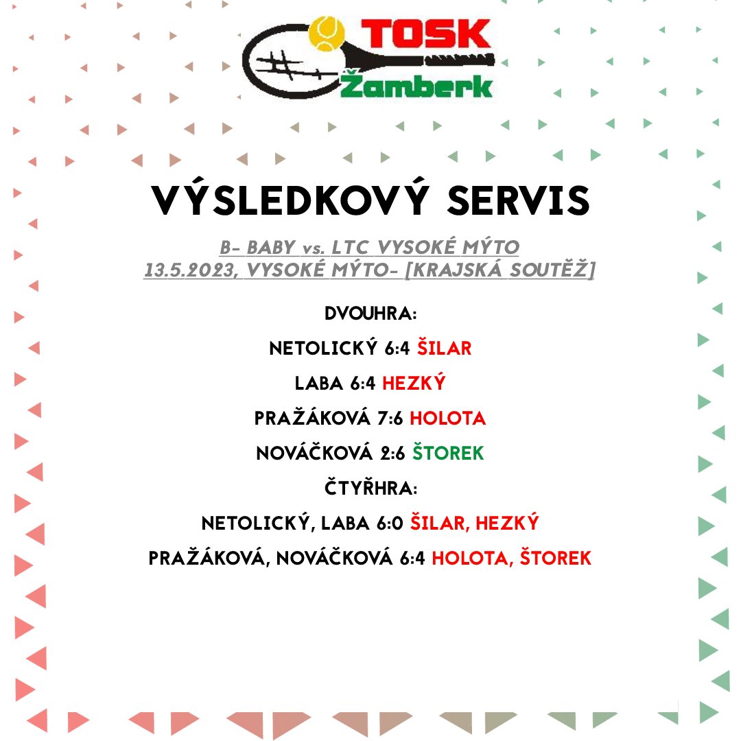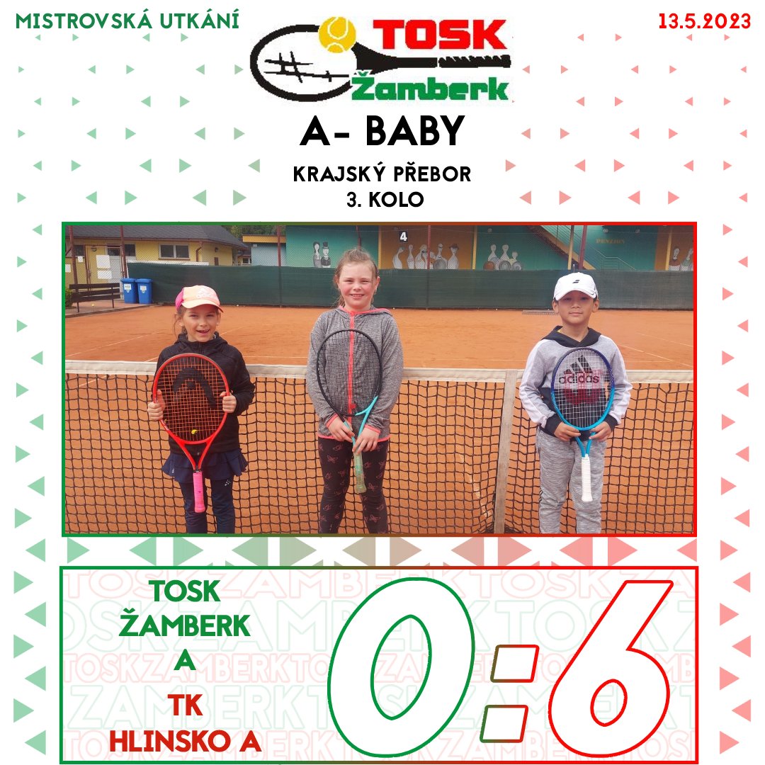 A tým babytenistů podlehl na domácích kurtech TK Hlinsko 0:6 a v neúplné tabulce (TK Letohrad ze soutěže odstoupil) bude mít za necelých čtrnáct dnů poslední šanci vybojovat premiérové vítězství v soutěži. „Na zápasech bylo vidět, že naši babytenisté letos začínají na velkém hřišti, na které si postupně zvykají. Na všech je ale vidět pokrok po každém odehraném zápase. Takže porážka, ale zároveň velká zkušenost do budoucna,“ uvedl kapitán družstva Tomáš Lehký. Béčko prohrálo ve Vysokém Mýtě 1:5, o jediný bod se postaral Benjamin Štorek.