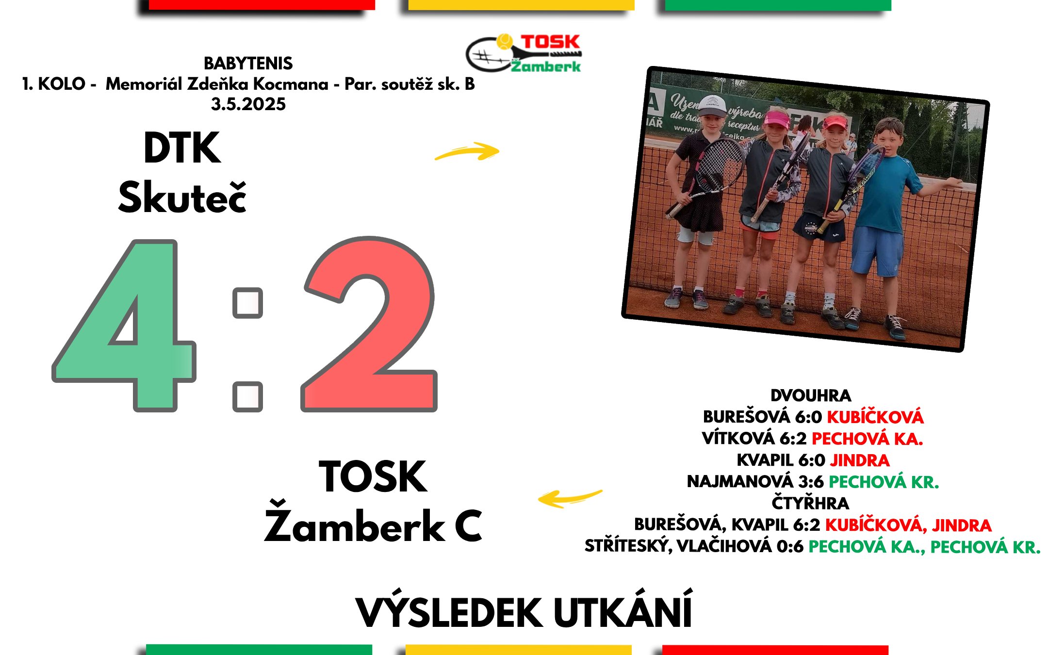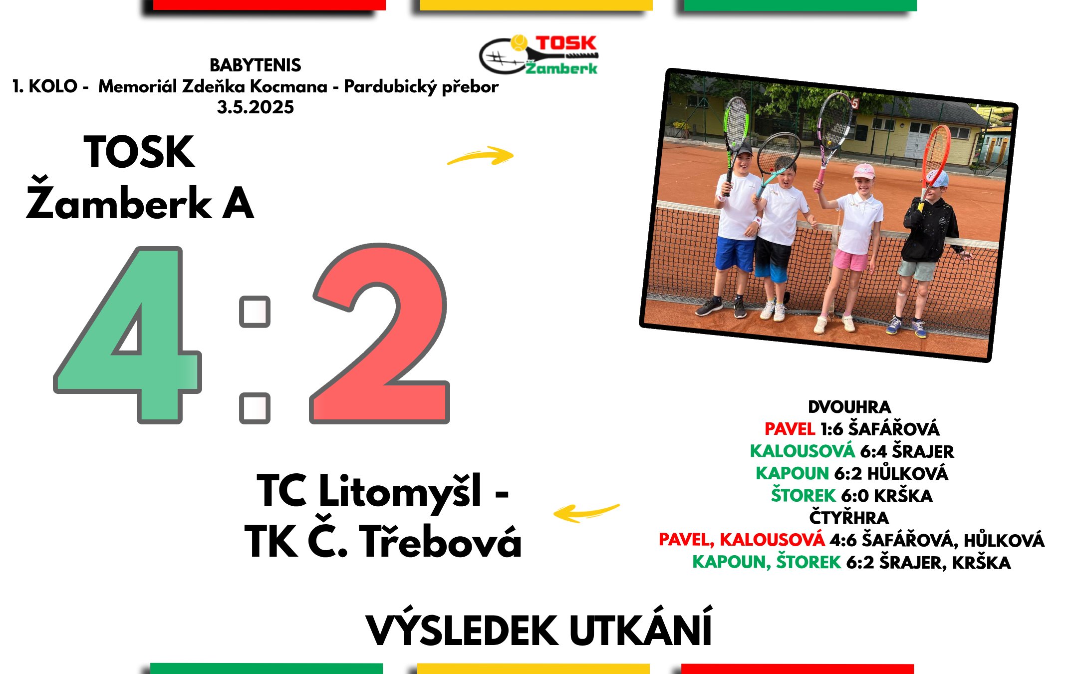 Nově sestavený tým C babytenistů složený z nováčků - malých hráčů narozených v roce 2017 - se poprvé představil na velkém kurtu a podlehl skutečským babytenistům 2:4. Zkušenější tým A (ročníky 2016) si v Pardubickém přeboru připsal důležité vítězství nad spojeným týmem Litomyšle a České Třebové stejným poměrem 4:2. O nadcházejícím víkendu se zapojí i B tým, který odehraje své první soutěží zápasy letošní sezóny.