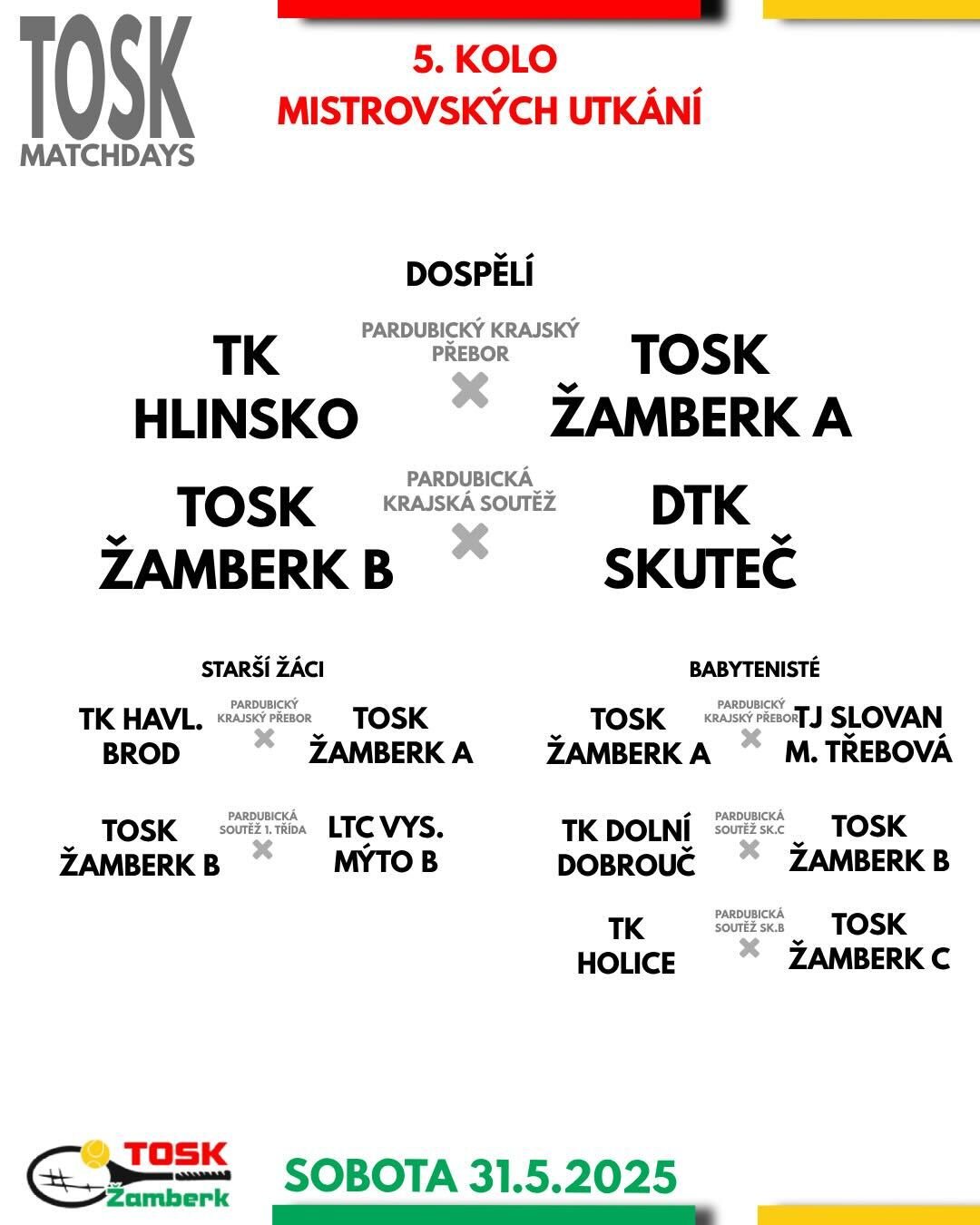 Minitenis A i B vyráží do Svitav bojovat o finálovou účast na závěrečném turnaji východočeské oblasti. Výborně nakročeno má A družstvo, které po dvou výhrách vede tabulku a míří za postupem! Mladší žáci sehrají poslední kolo mistrovské sezóny. A tým je stále ve hře o první místo, o které se strhne přímý souboj mezi čtyřmi týmy. Tento víkend se představí všechna tři družstva babytenisu: A tým v Pardubickém přeboru hájí první místo proti Moravské Třebové, týmy B a C čekají výjezdy do Dolní Dobrouče a Holic.
