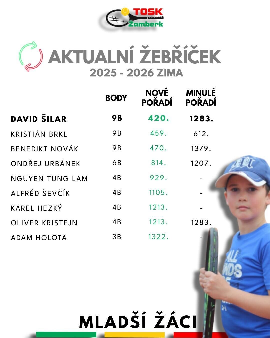 Naši hráči a hráčky v žákovských kategoriích v novém žebříčku zaznamenali výrazný posun směrem vzhůru. Jsme rádi, že systematická a poctivá práce během celé sezóny přináší zasloužené výsledky.