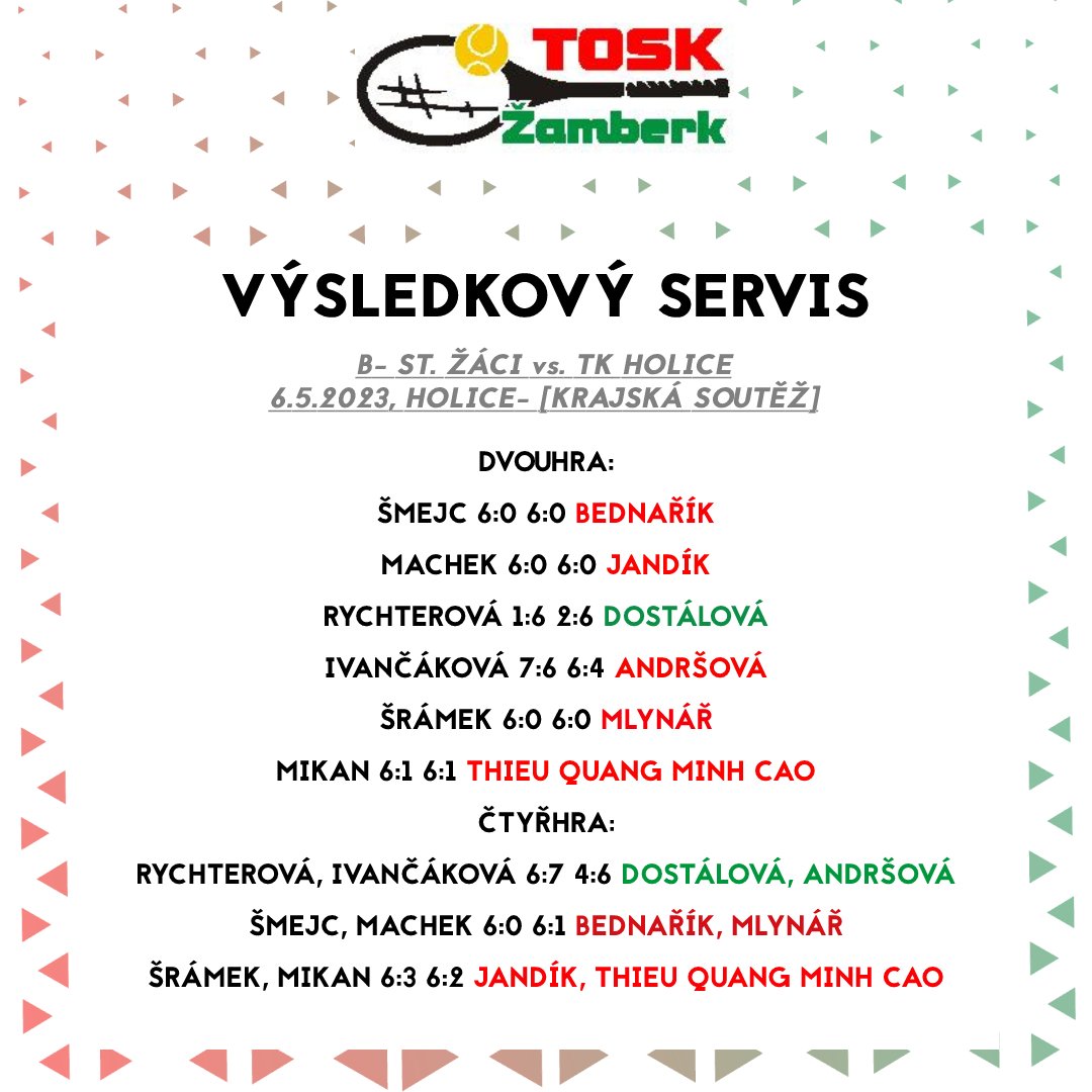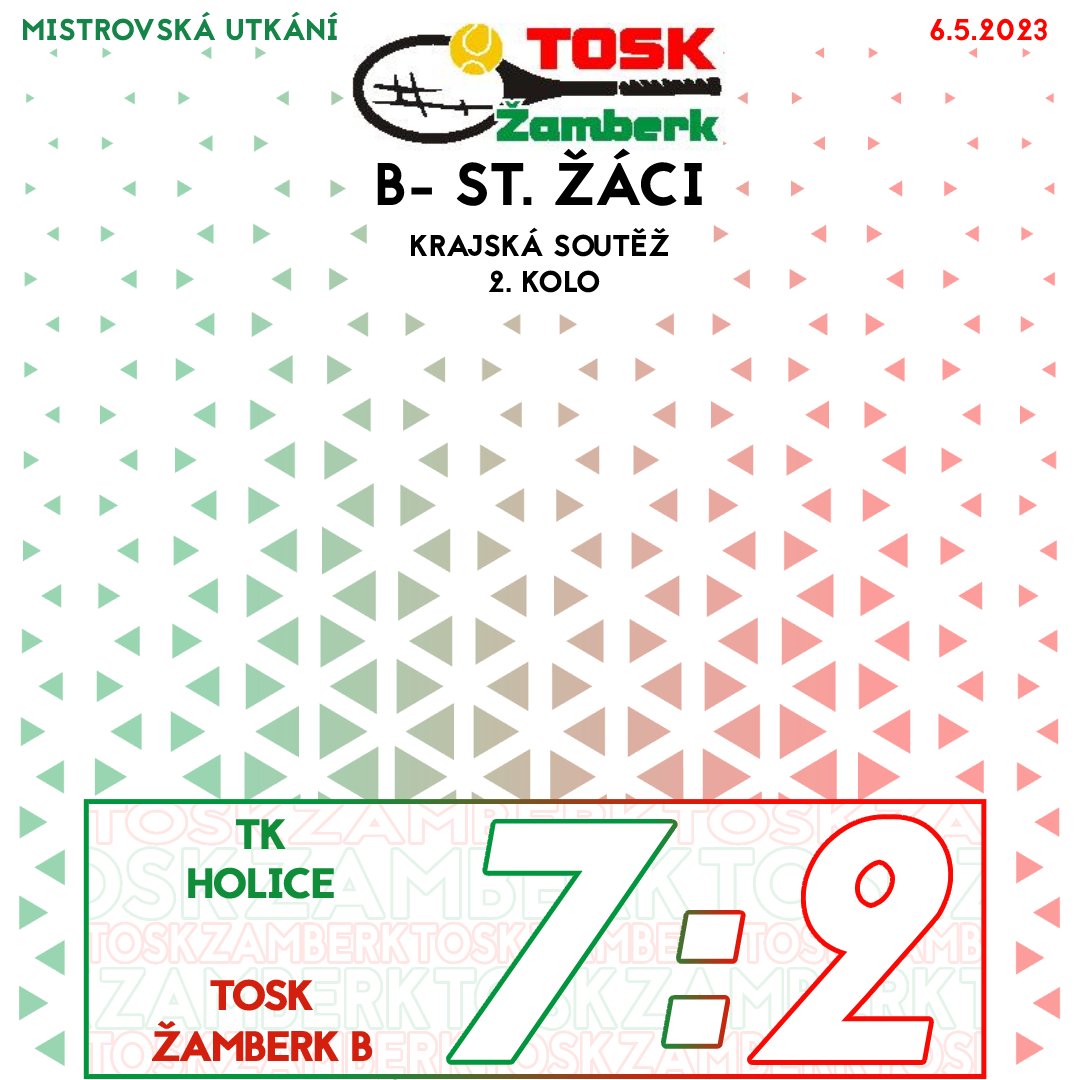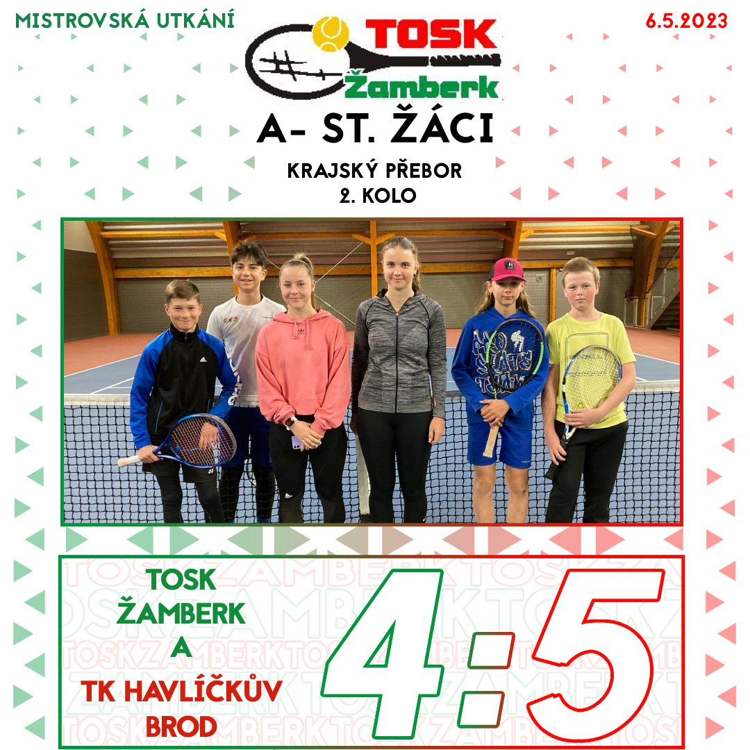 A družstvo starších žáků v napínavém sobotním utkání, jehož program byl kvůli dešti opět rozdělen mezi halu a poté venkovní kurty, nakonec tahalo za kratší konec a celkově prohrálo 4:5, když po dvouhrách byl vyrovnaný stav 3:3. „Naše děvčata hrála skvěle a se soupeřkami si poradila. Sabče Macháčkové v koncovce pomohlo povzbuzování pánské části týmu. Kluci proti sobě měli mnohem zkušenější soupeře, kteří se pravidelně zúčastňují turnajů. Výkon našich kluků byl na hranici jejich momentálních možností,“ ocenila svůj tým jeho kapitánka Jiřina Kvapilová. Béčko nepochodilo v Holicích, výsledkem je porážka 2:7. „Kluci se pořád učí a podle toho zápasy také vypadaly. Každé odehrané utkání je pro ně ale jedině plus. Holky musím pochválit,“ pronesl kapitán družstva Martin Dostál.