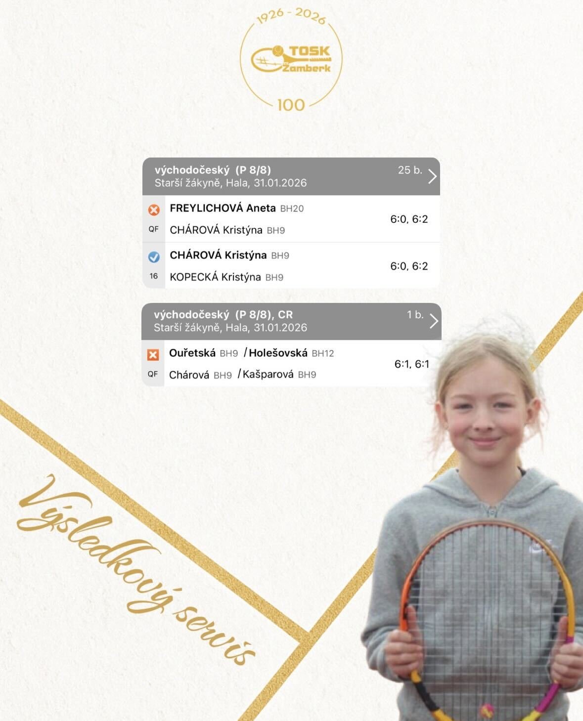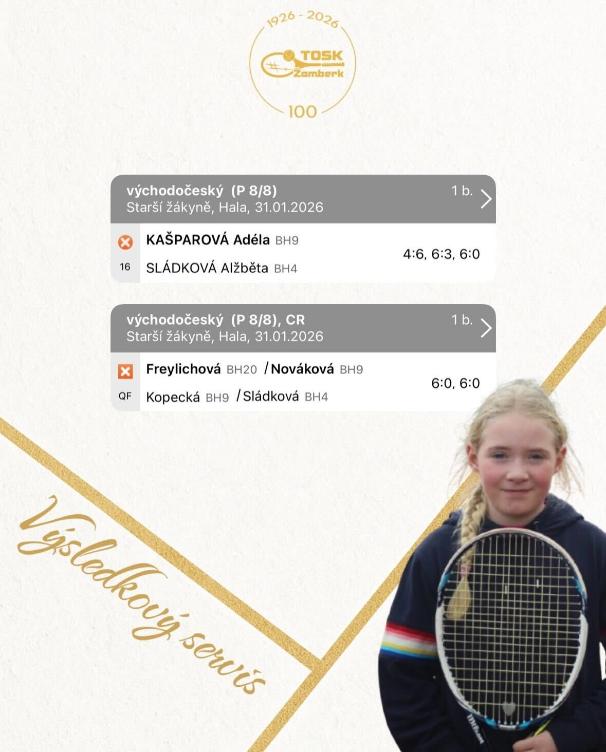 Na domácích oblastních přeborech starších žákyň se představily tři hráčky TOSK Žamberk. Věkem stále ještě mladší žákyně Valérie Adamcová si společně s Annou Štrofovou (TK Eden HK) zahrála finále čtyřhry. Ve dvouhře pak Valérie narazila ve čtvrtfinále na pozdější vítězku turnaje. Kristýna Chárová dokázala ve dvouhře vybojovat vítězný zápas a zanechala na domácích kurtech dobrý dojem. Alžběta Sládková svedla v 1. kole vyrovnanou bitvu, která však skončila těsnou porážkou. Domácí hráčky se v silné konkurenci rozhodně neztratily a potvrdily, že žamberský tenis má i v této kategorii své zastoupení.