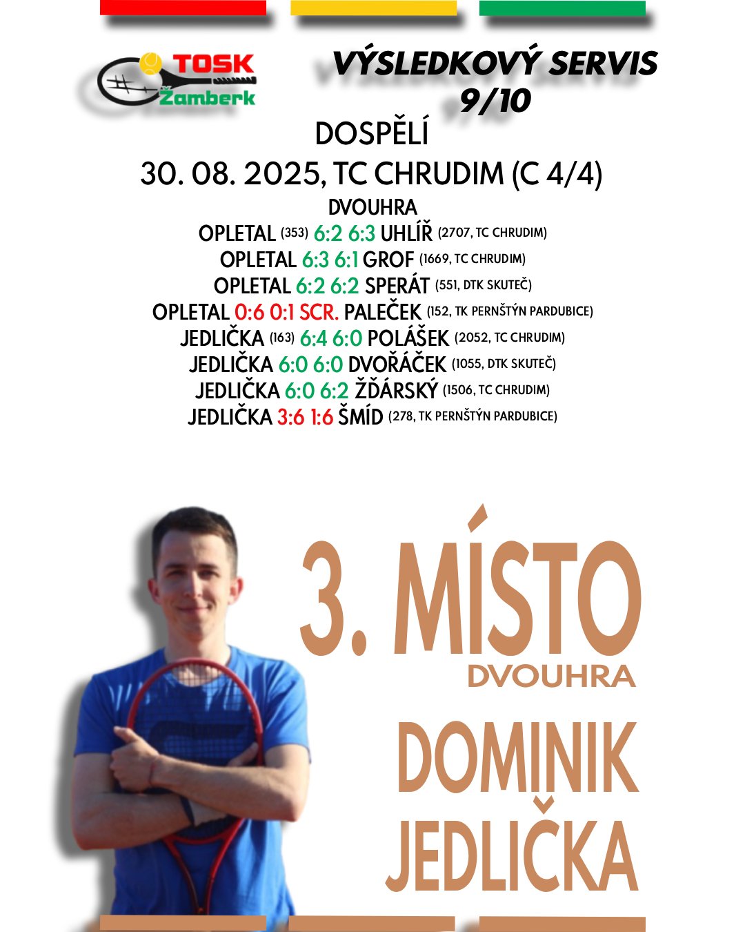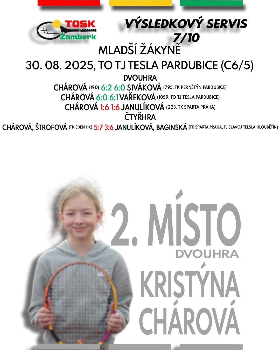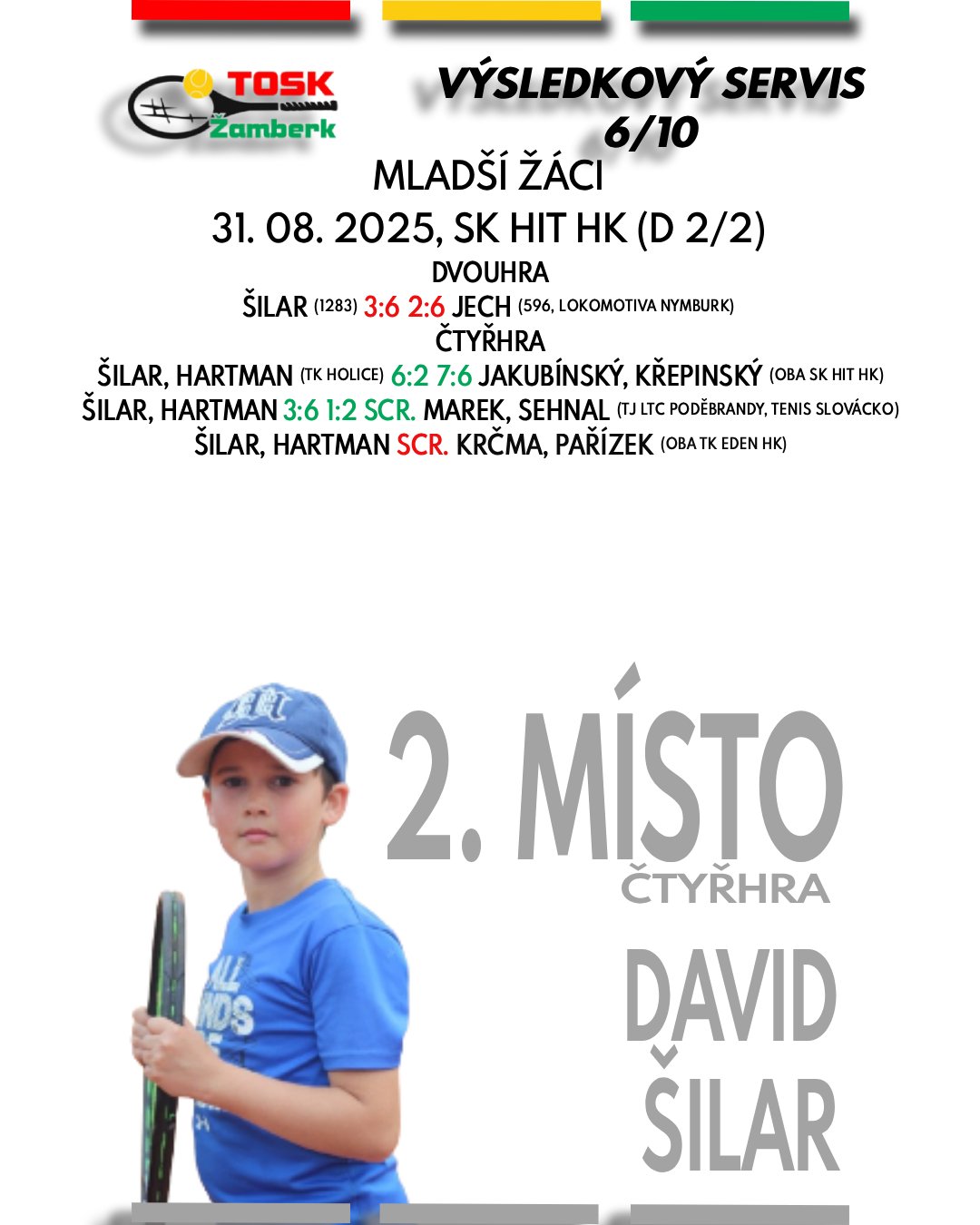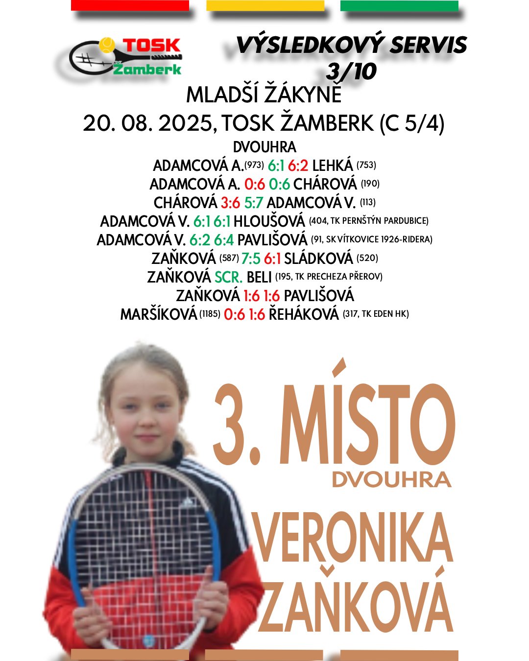 Druhá polovina srpna přinesla na turnajích tenistům TOSK Žamberk řadu úspěchů napříč všemi kategoriemi. Mnoho dobrých zápasů, nové zkušenosti a k tomu všemu i skvělá bilance devíti medailových umístění. Gratulujeme Valérii Adamcové k parádnímu double na domácím turnaji, Davidu Šilarovi ke stříbrné čtyřhře v Hradci Králové a samozřejmě i všem ostatním hráčům za výborné výkony a reprezentaci našeho klubu.