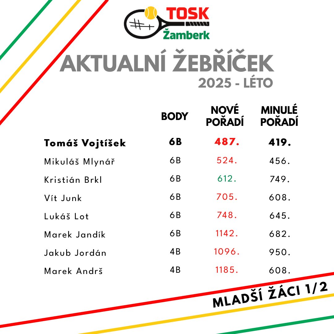 Valérie Adamcová se zařadila mezi absolutní špičku východočeské oblasti v kategorii mladších žákyň, kde jí aktuálně patří 8. místo. Na republikové úrovni si polepšila o 59 příček a drží 113. místo v ČR! V létě tak může reálně pomýšlet na průlom do TOP 100. Na vlně zlepšení se veze i Kristýna Chárová, která zaznamenala skok o 93 míst a nově jí patří 190. příčka. Ve východočeském kraji pak drží skvělé 15. místo! Kompletní žebříček najdete v přiložené grafice. Gratulujeme všem hráčům a hráčkám k jejich umístění a děkujeme za skvělou reprezentaci klubu. Držíme palce do letní části sezóny!