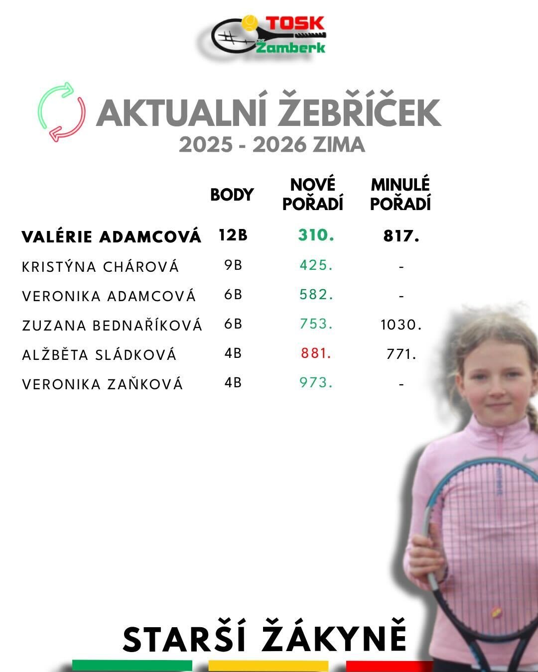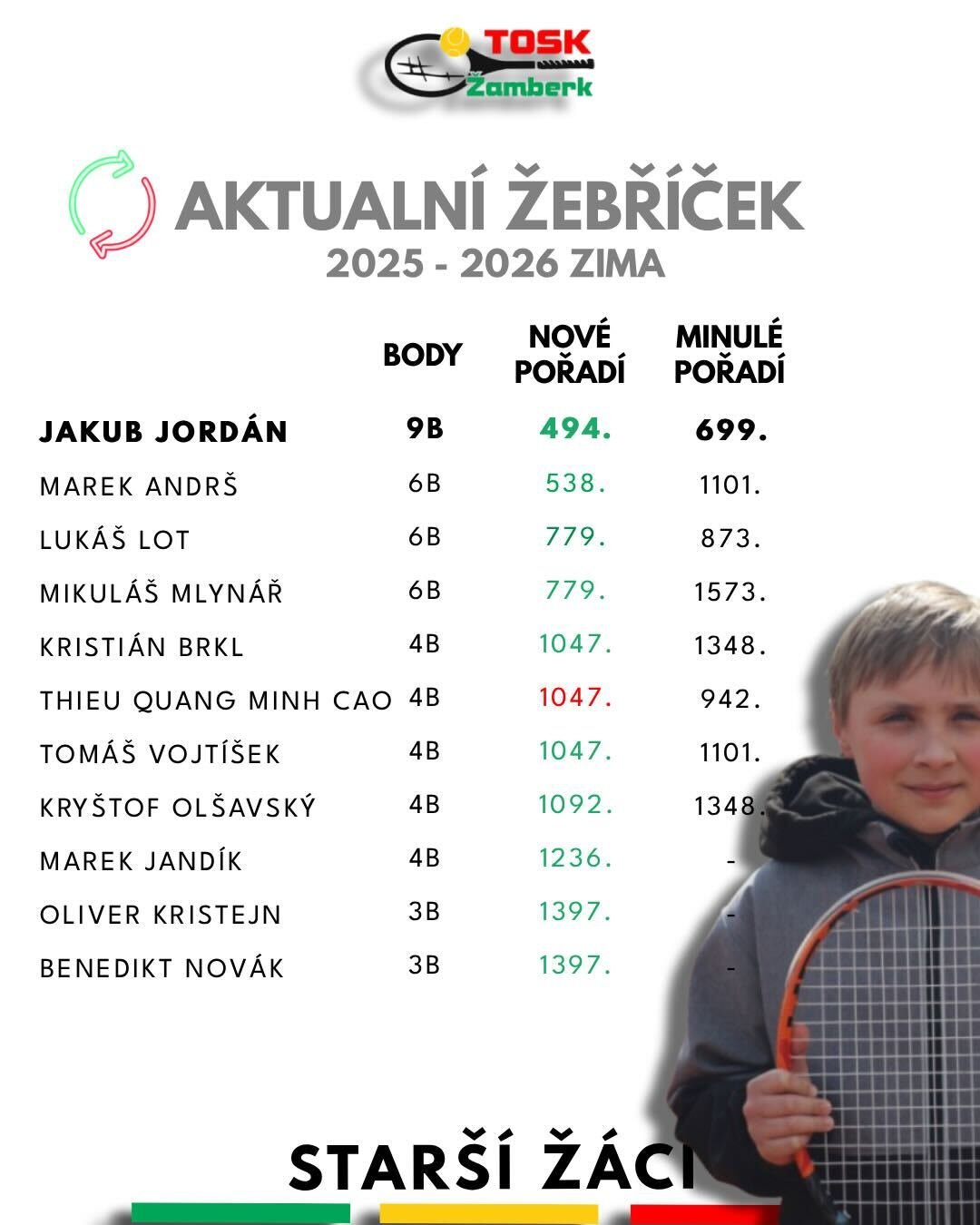 Naši hráči a hráčky v žákovských kategoriích v novém žebříčku zaznamenali výrazný posun směrem vzhůru. Jsme rádi, že systematická a poctivá práce během celé sezóny přináší zasloužené výsledky.