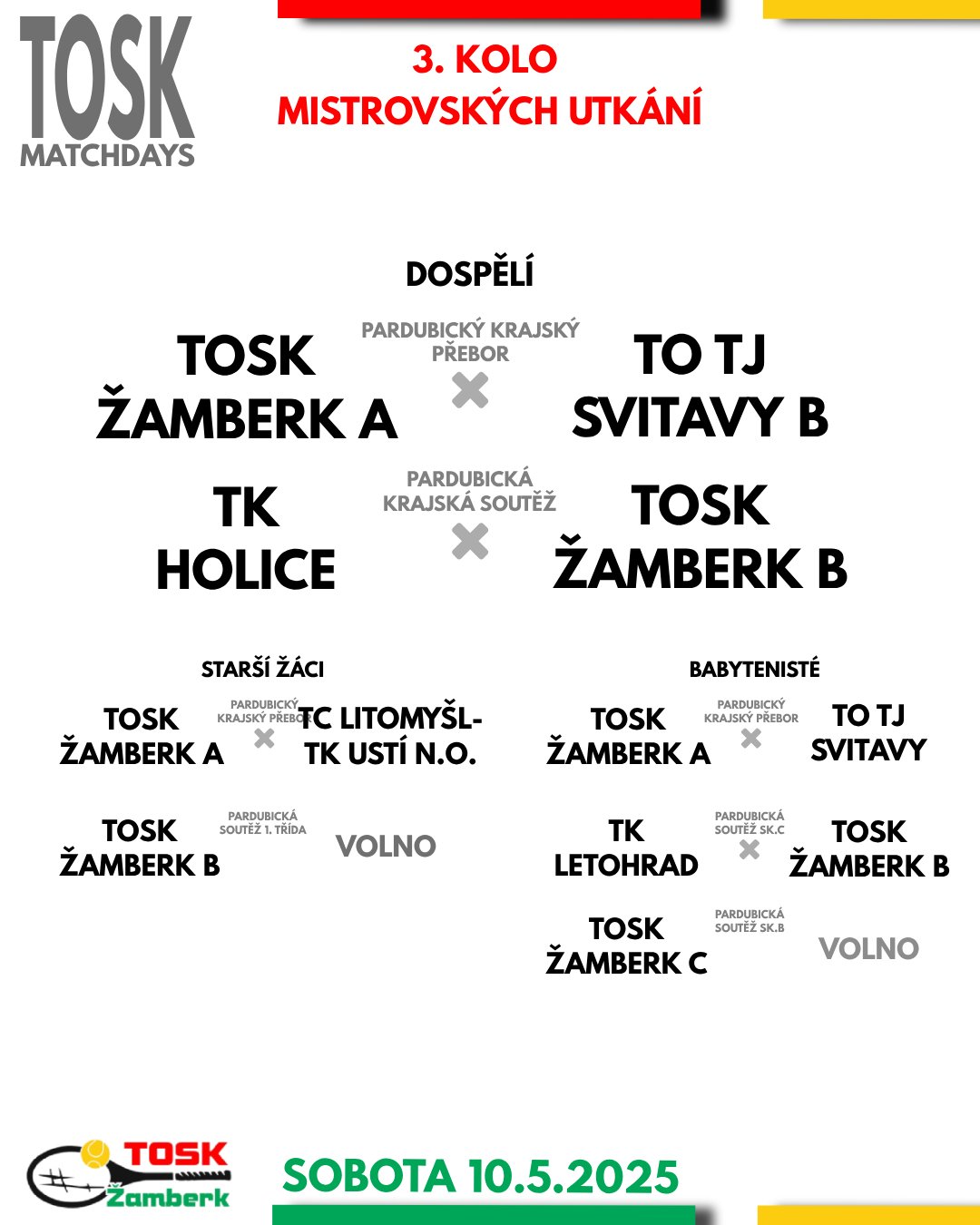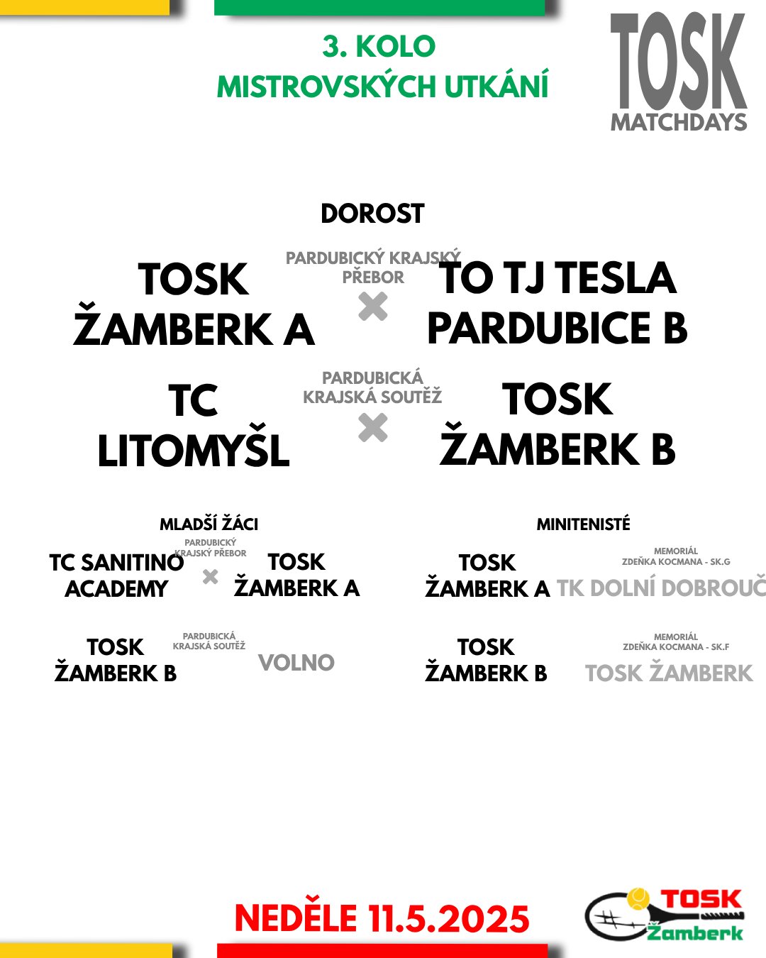 Neděle: Dorost A čeká třetí střet s Pardubicemi, tentokrát Tesla B Mladší žáci A vyráží do Litomyšle na duel proti SANITINO Academy Minitenisté budou chtít navázat na vítězství ve skupině
