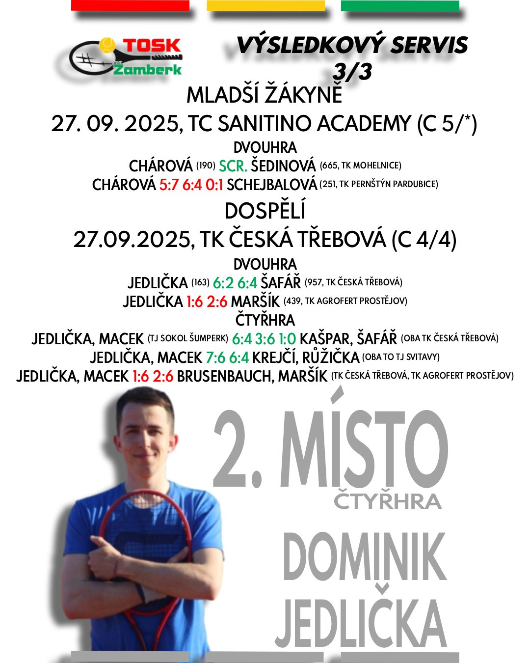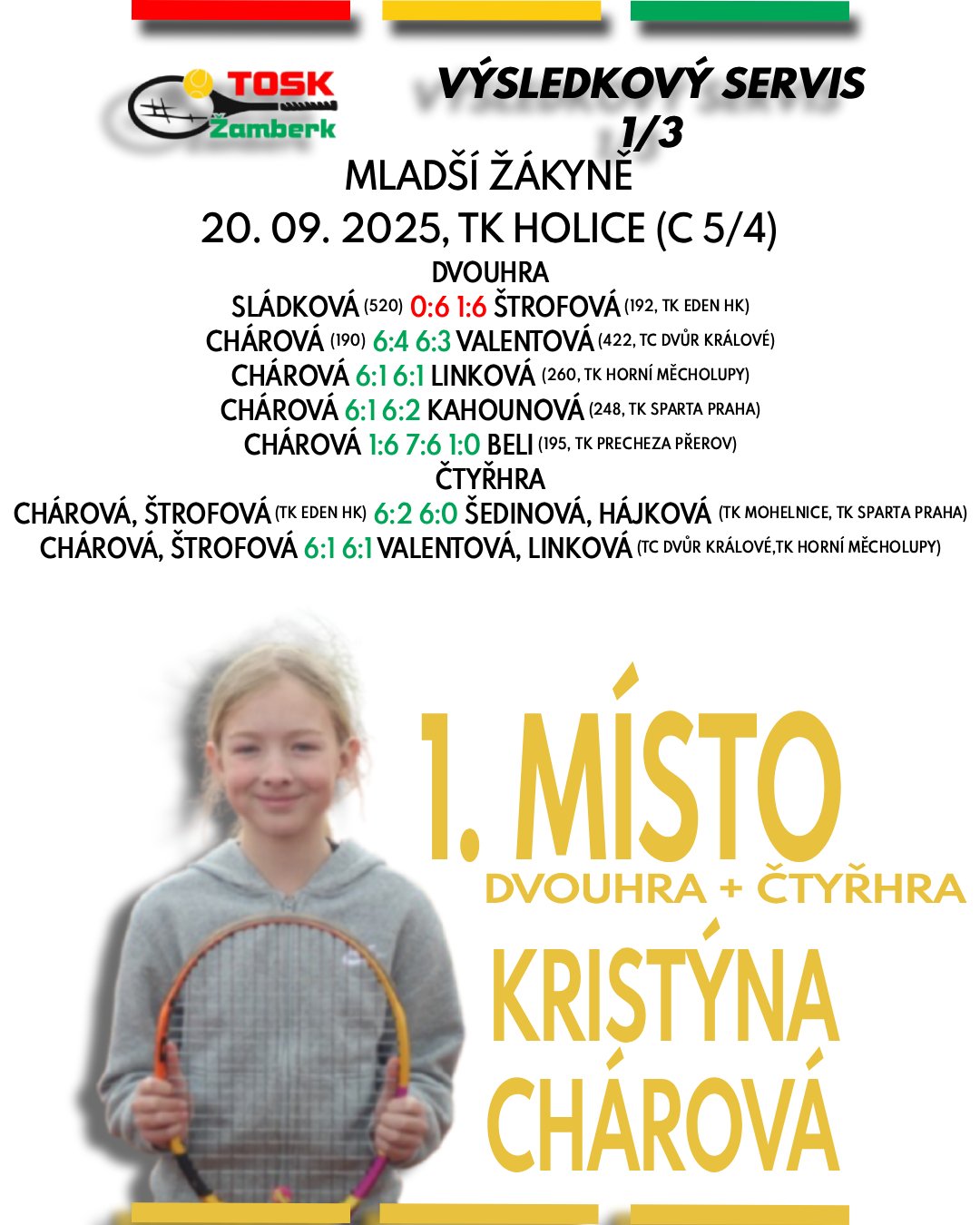 Letní část sezóny 2025 se uplynulý víkend uzavřela a my přinášíme poslední výsledkový servis tohoto období. Kristýna Chárová se s kategorií mladších žákyň rozloučila tím nejlepším možným způsobem – na turnaji v Holicích získala double (vítězství ve dvouhře i čtyřhře). Dařilo se také Dominiku Jedličkovi, který si v České Třebové zahrál finále čtyřhry.