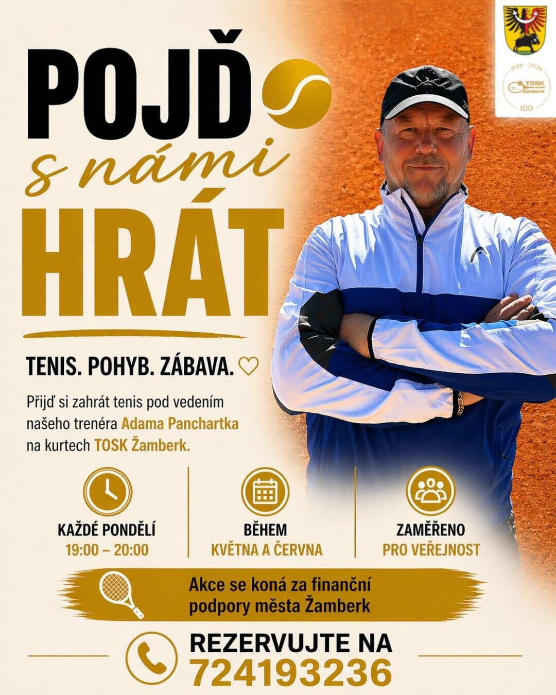 Projekt „Pojď s námi hrát“ už několik let zpřístupňuje tenis veřejnosti v Žamberku – a letos pokračuje dál. Chceš si vyzkoušet tenis, protáhnout se po práci nebo jen aktivně strávit večer na čerstvém vzduchu? Pak jsi vítán. Tréninky probíhají pod vedením zkušeného trenéra Adama Panchartka a jsou otevřené všem bez ohledu na věk i výkonnost.