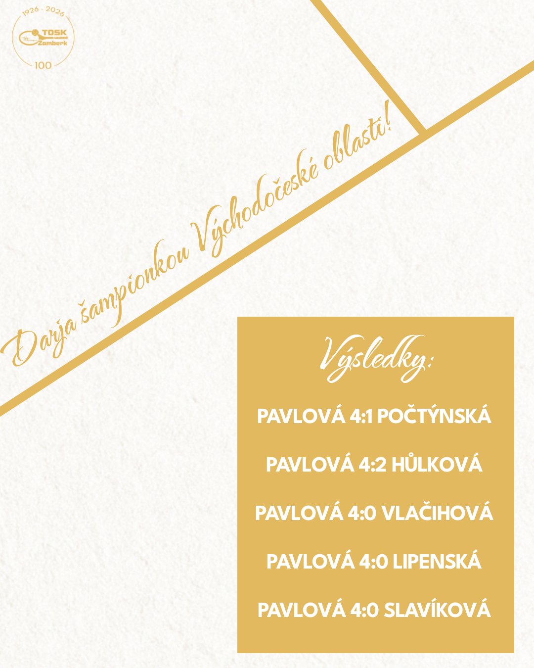 Jubilejní sezona, v níž TOSK Žamberk slaví 100 let od svého založení, začala pro klub tím nejlepším možným způsobem. O skvělý úvodní úspěch se postarala Darja Pavlová, která triumfovala na halovém oblastním přeboru v kategorii babytenis. V sobotu 31. ledna nenašla ve Vysokém Mýtě na atypickém povrchu (koberec) ani jednu přemožitelku. Turnajem prošla naprosto suverénně, když zvítězila ve všech pěti utkáních a dosáhla impozantního skóre gamů 20:3.