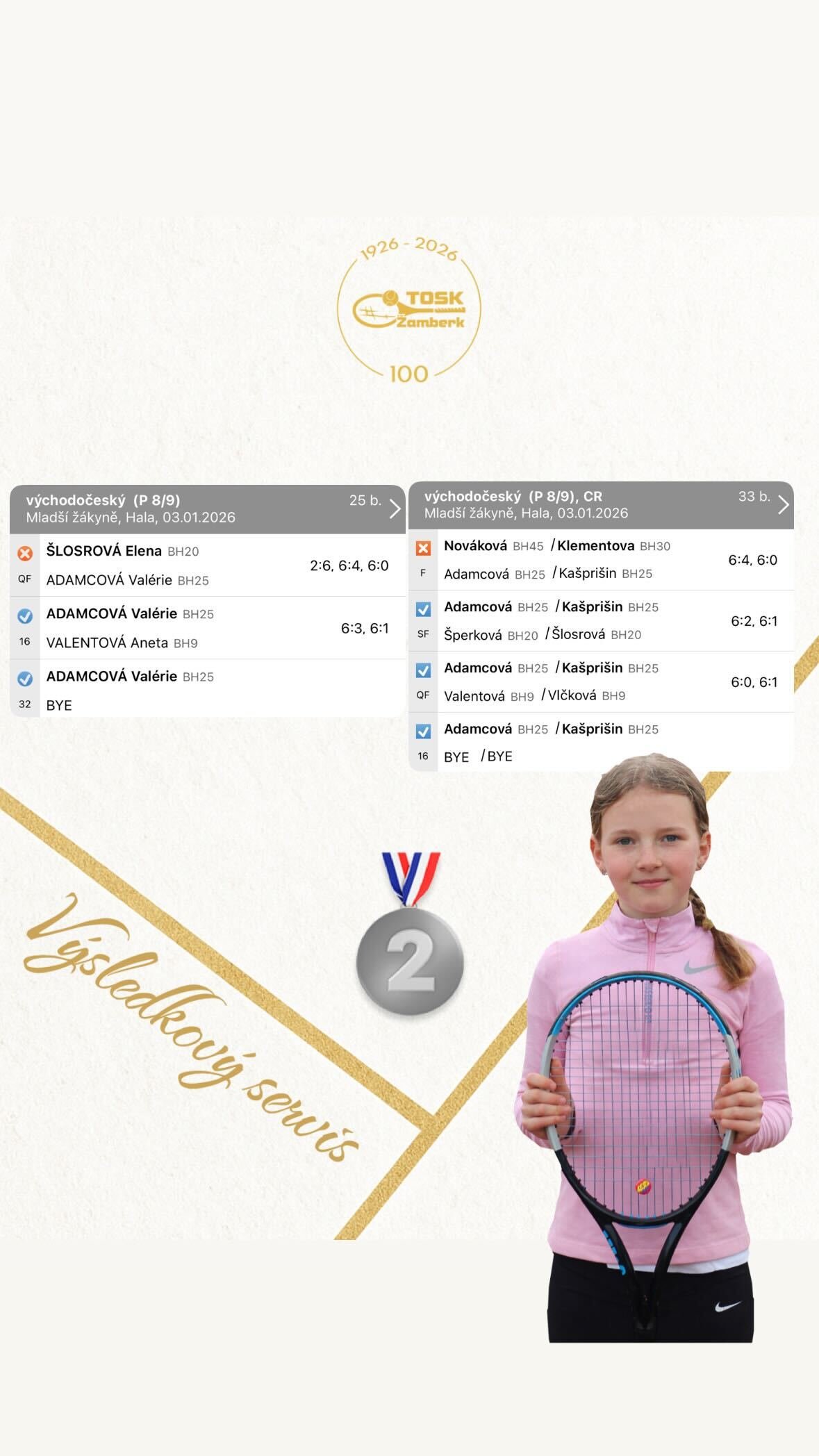 Skvělý výsledek zaznamenala Valérie Adamcová, která si na oblastních přeborech mladších žákyň v Hradci Králové (areál HIT) zahrála finále čtyřhry a vybojovala krásné 2. místo.