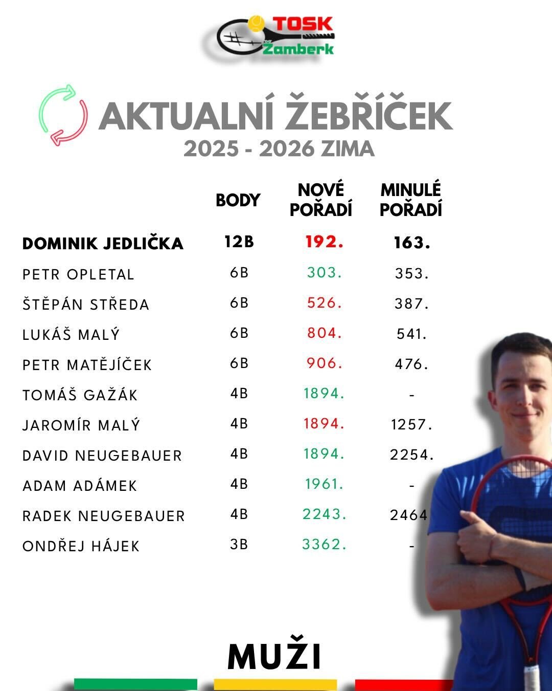 Český tenisový svaz zveřejnil aktuální žebříčky pro zimní sezónu, zástupci TOSK si výrazně polepšili Jandík Martin13. 10. 2025Celý článek