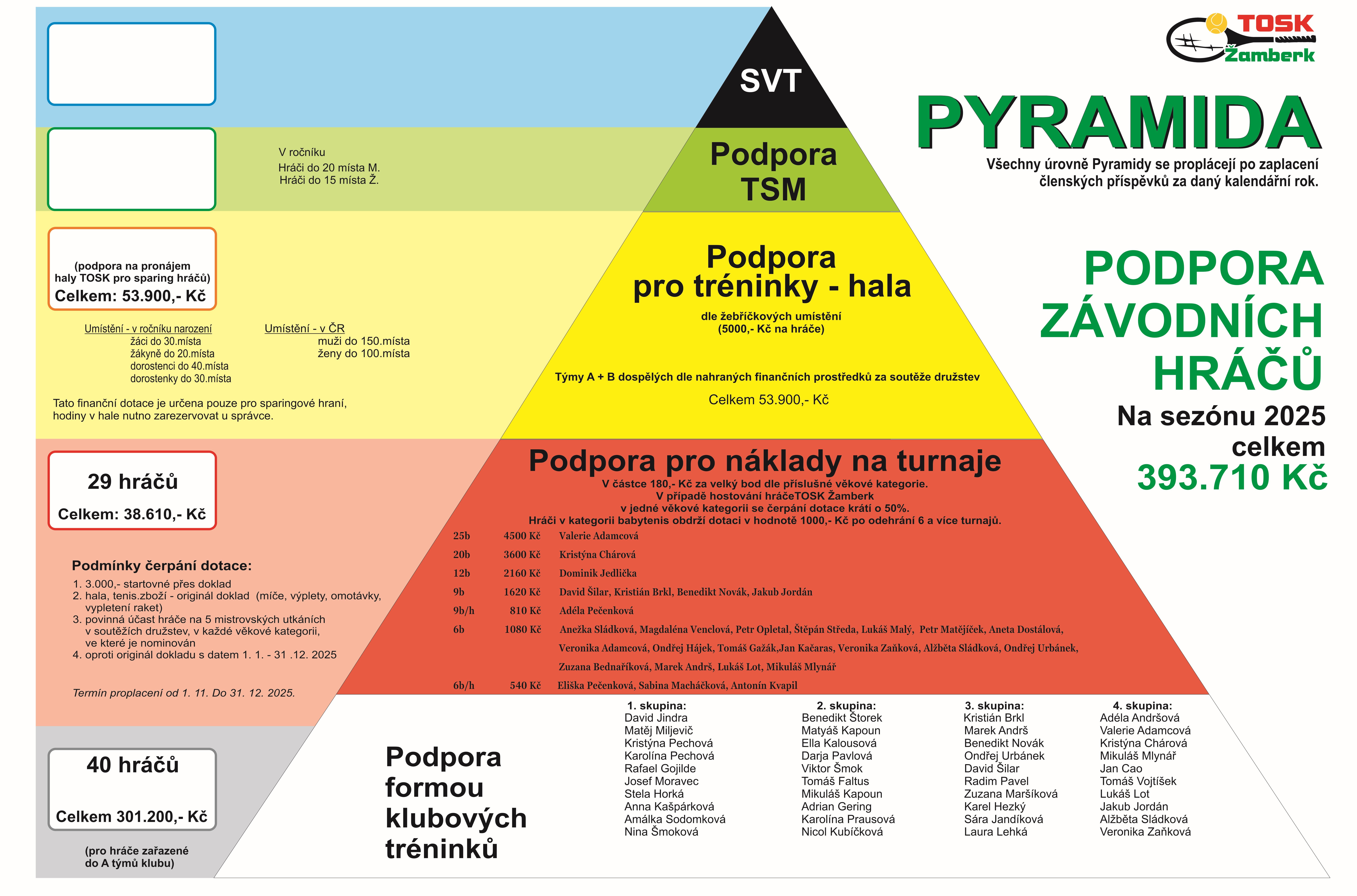 - motivační program Pyramida (podrobnosti v jiné části webu) spojený s finanční podporou tréninku, účasti na turnajích atd.